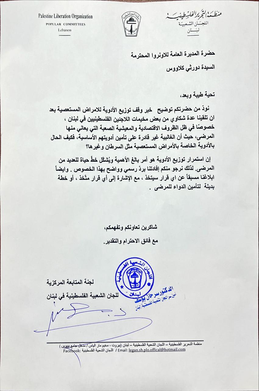 نود من حضرتكم توضيح خبر وقف توزيع الأدوية للأمراض المستعصية، بعد أن تلقّينا عدة شكاوى من بعض تجمعات اللاجئين الفلسطينيين في لبنان، خصوصًا في ظلّ الظروف الاقتصادية والمعيشية الصعبة التي يعاني منها المرضى، حيث إن العيادات غير قادرة على تأمين أدويتهم الأساسية، فكيف الحال بالأدوية الخاصة بالأمراض المستعصية مثل السرطان وغيرها؟