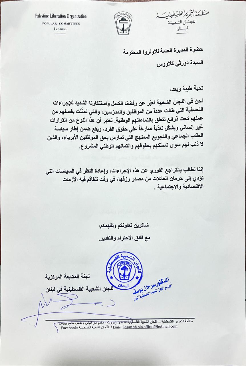 وجّهت اللجان الشعبية الفلسطينية في لبنان، برئاسة الدكتور يوسف حسن يوسف، كتابين إلى المديرة العامة لوكالة الأونروا، دوروثي كلاوس؛ الأول تستوضح فيه خبر وقف توزيع الأدوية للأمراض المستعصية، والثاني تستنكر فيه فصل موظفين من الوكالة.