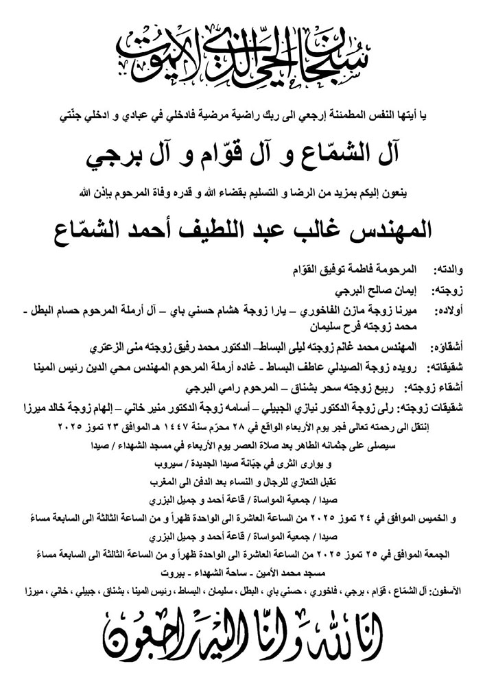 هذا وستتقبل العائلات التعازي يوم الجمعة الموافق 25 تموز 2025، في مسجد محمد الأمين – ساحة الشهداء، بيروت، من الساعة العاشرة صباحًا حتى الواحدة ظهرًا، ومن الثالثة عصرًا حتى السابعة مساءً.