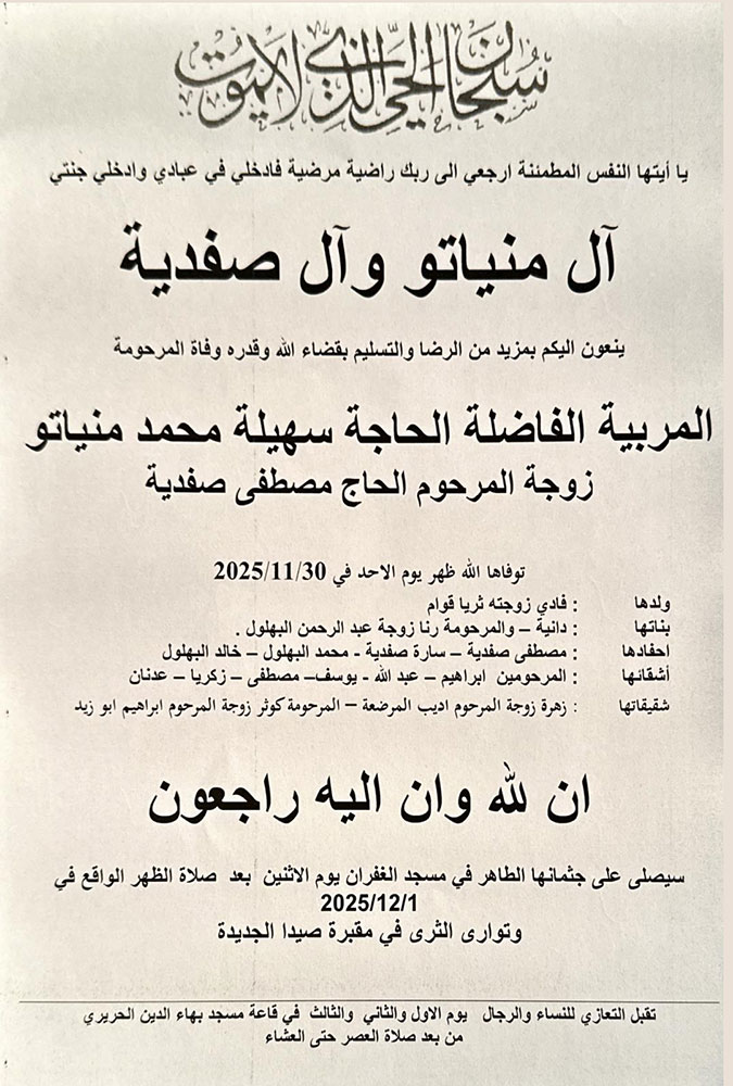 شيّعت عائلتا منياتو وصفدية وأهالي مدينة صيدا، المربية الفاضلة الحاجة سهيلة محمد منياتو، زوجة المرحوم الحاج مصطفى صفدية، بمشاركة حشد من الشخصيات وممثلي القوى السياسية اللبنانية والفلسطينية، ومن روابط العائلات الصيداوية.