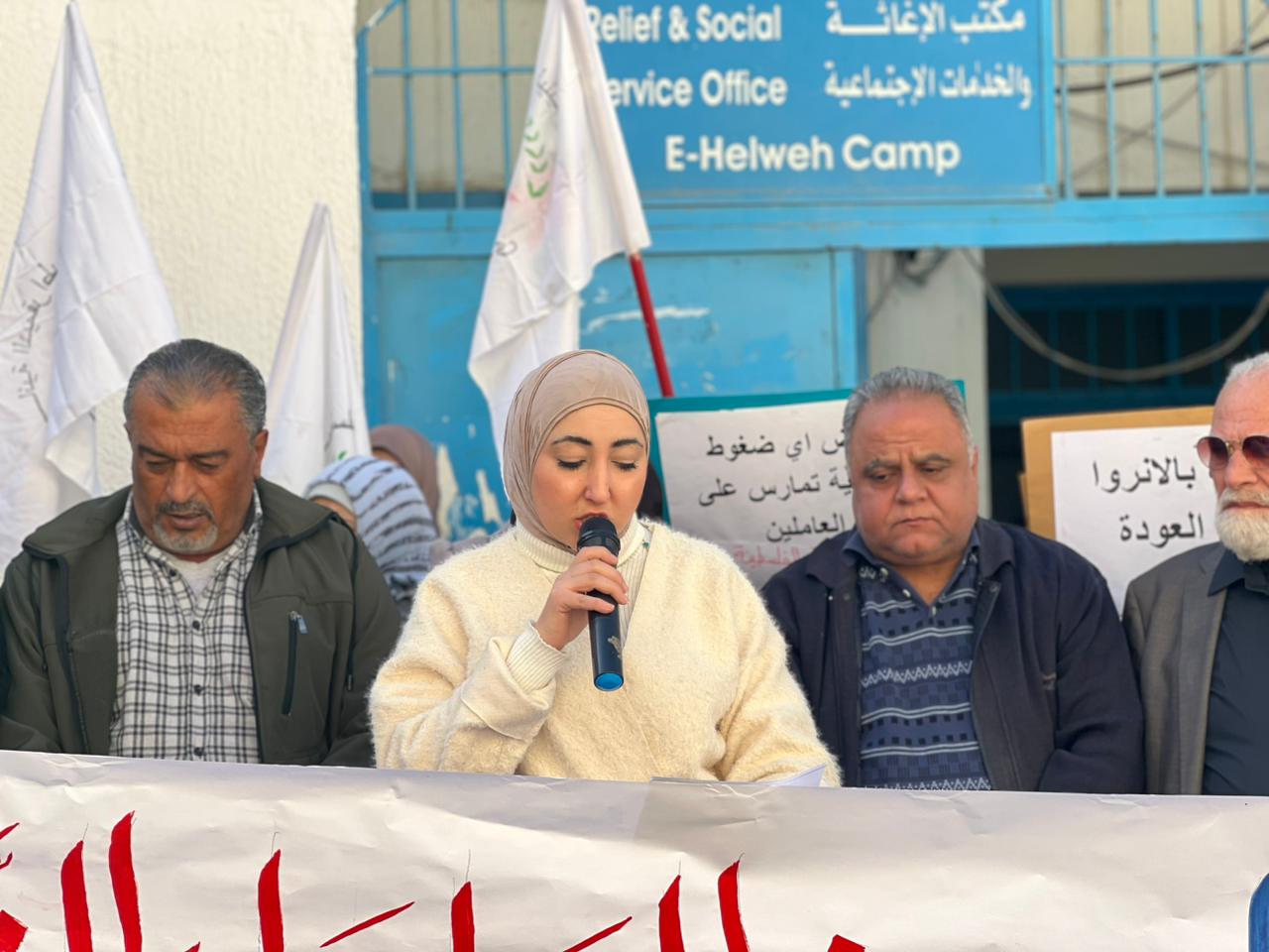 بدورها، دعت صابرين الواكد، ممثلة لجان المرأة العاملة الفلسطينية، في كلمتها إلى توحيد الموقف الفلسطيني ضمن خطة مواجهة شاملة للحفاظ على وكالة الأونروا ومنع المزيد من التدهور في خدماتها وتقديماتها.