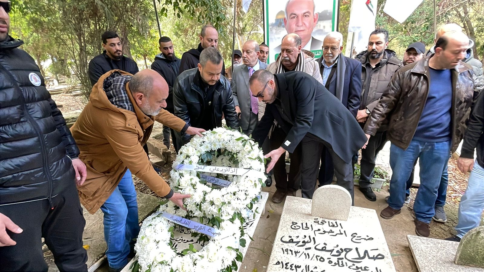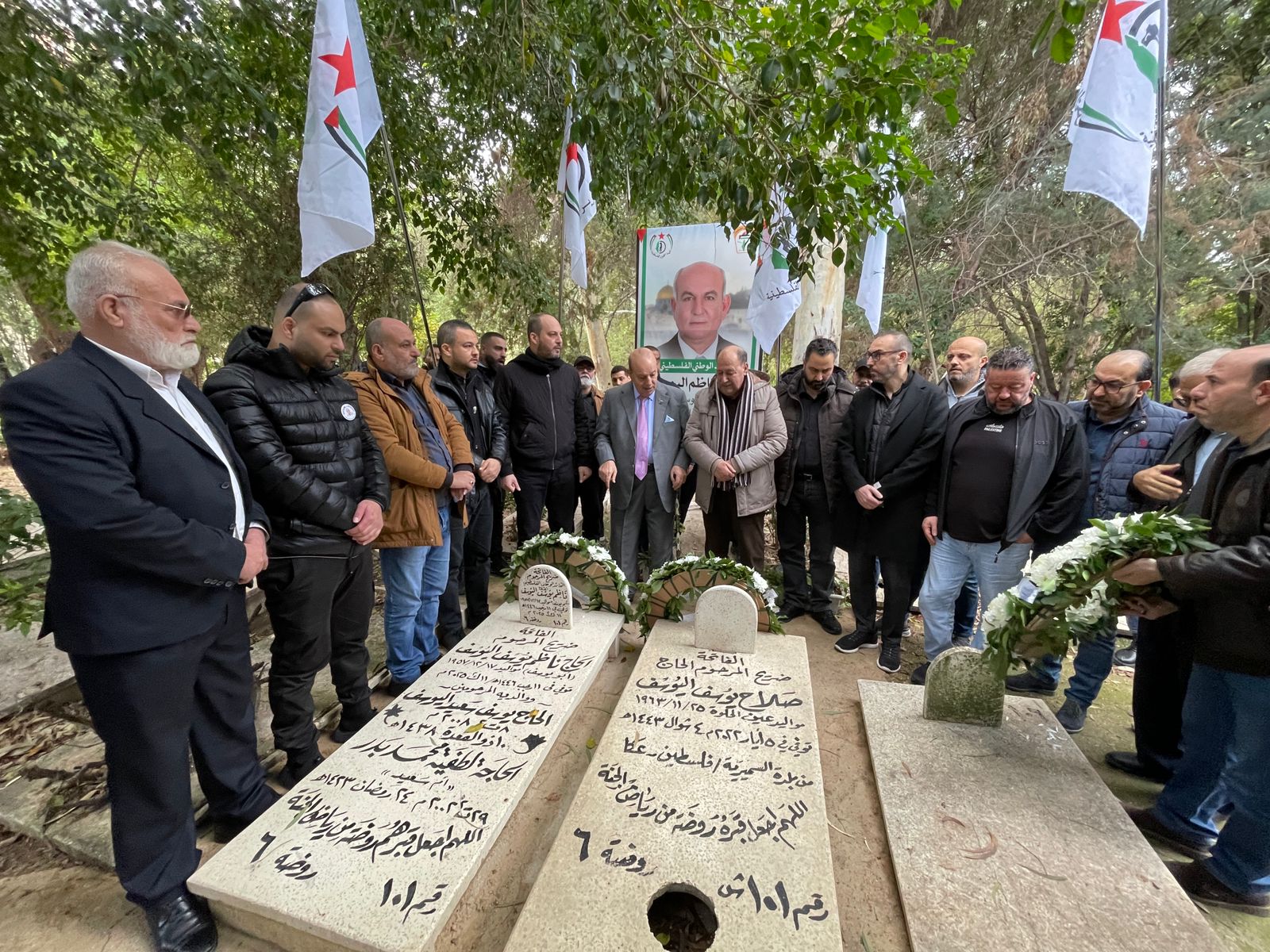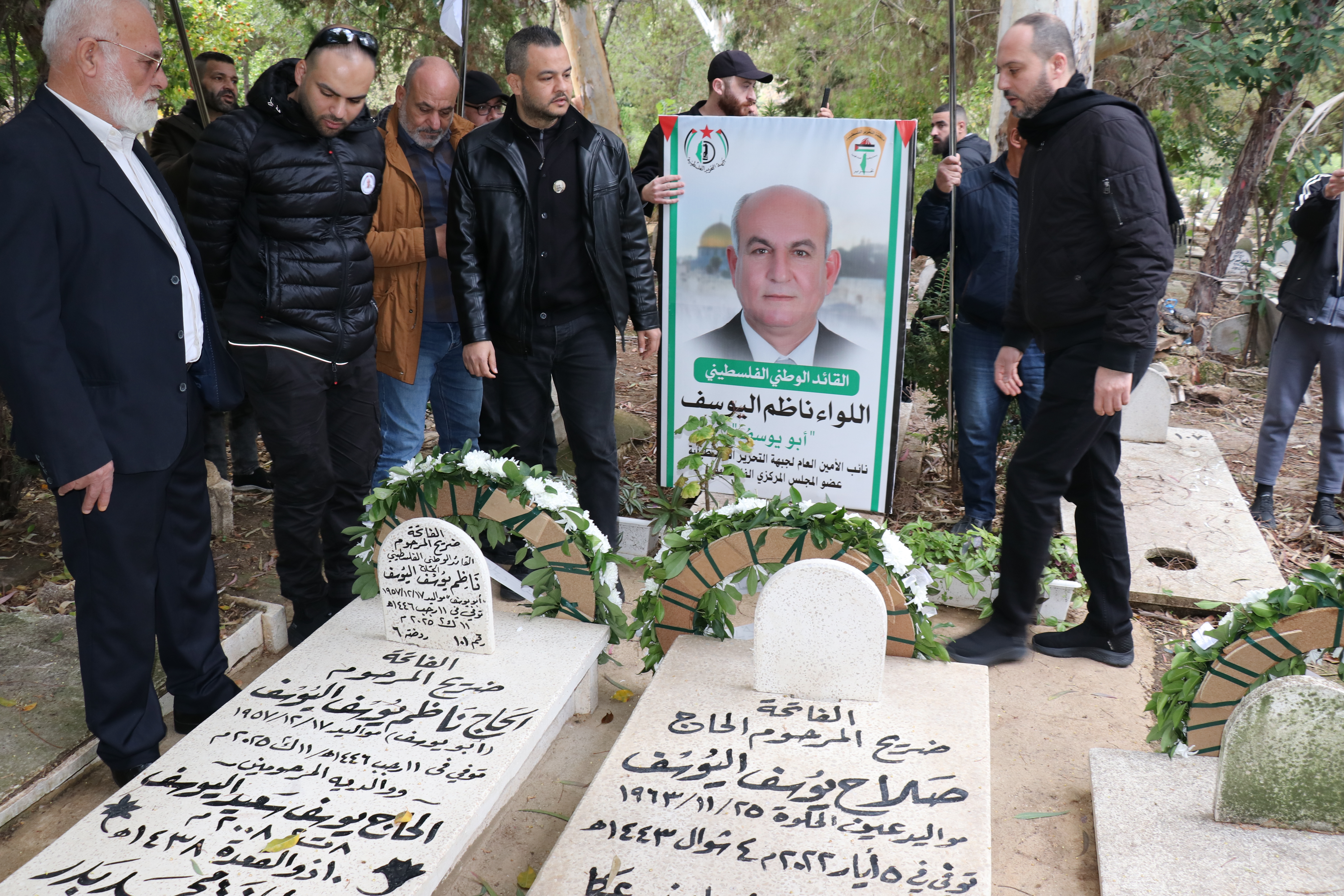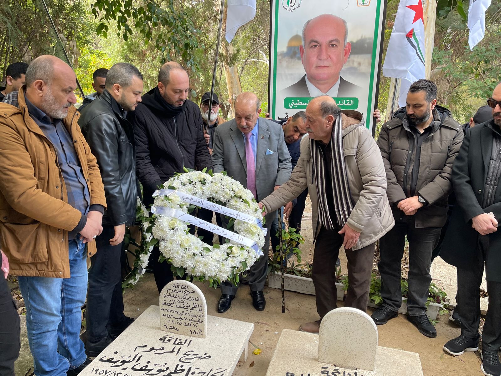 وفي مشهد امتزج فيه الحزن بالعهد، وُضعت أكاليل الورد على الضريح باسم كل من: رئيس المجلس الوطني الفلسطيني روحي فتوح، ممثلا بعضو المجلس المركزي السفير خالد عارف، وأمين سر المكتب السياسي للجبهة بلال قاسم، والدكتور علي كنج، وذلك بمشاركة العقيد فراس بركات، إلى جانب قيادات وكوادر الجبهة برئاسة مسؤول الساحة اللبنانية وعضو المجلس الوطني يوسف ناظم اليوسف وعائلة اليوسف التي ظلّت شريكة الدرب والتضحية.