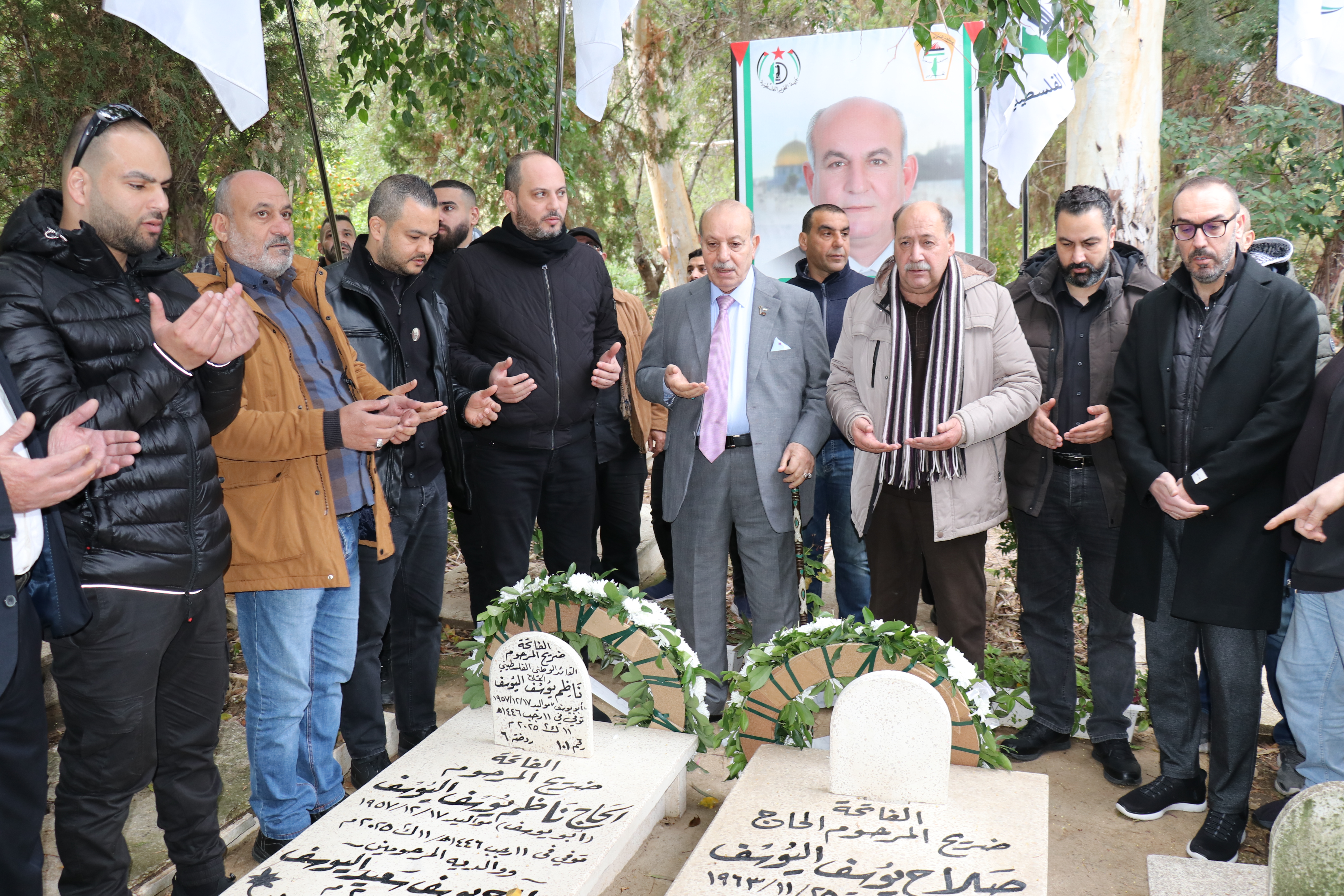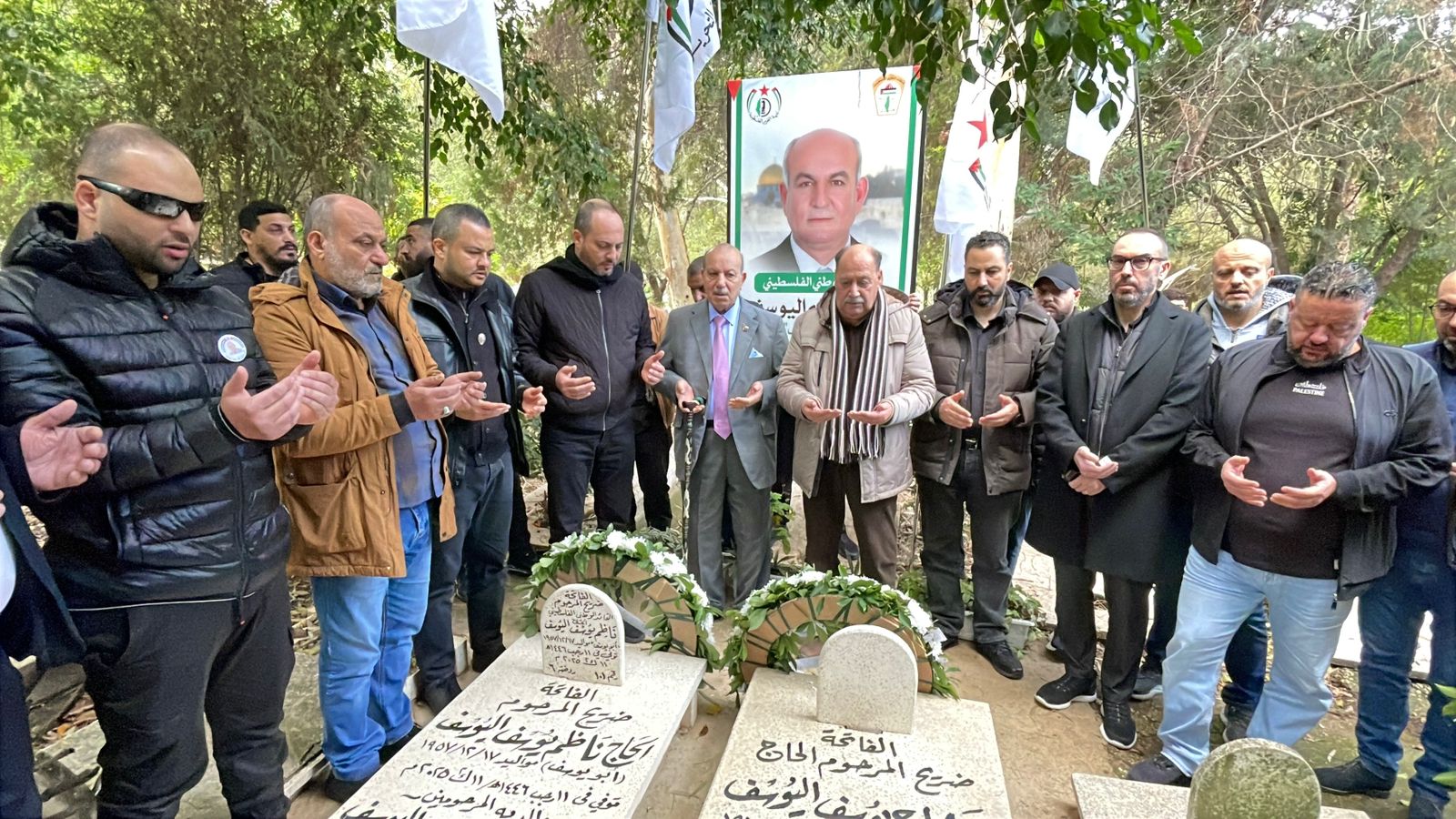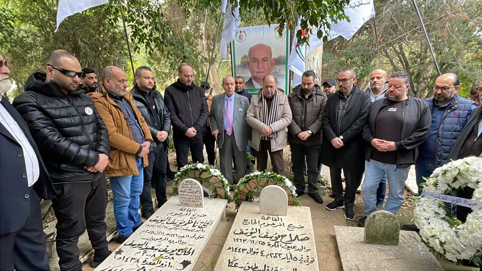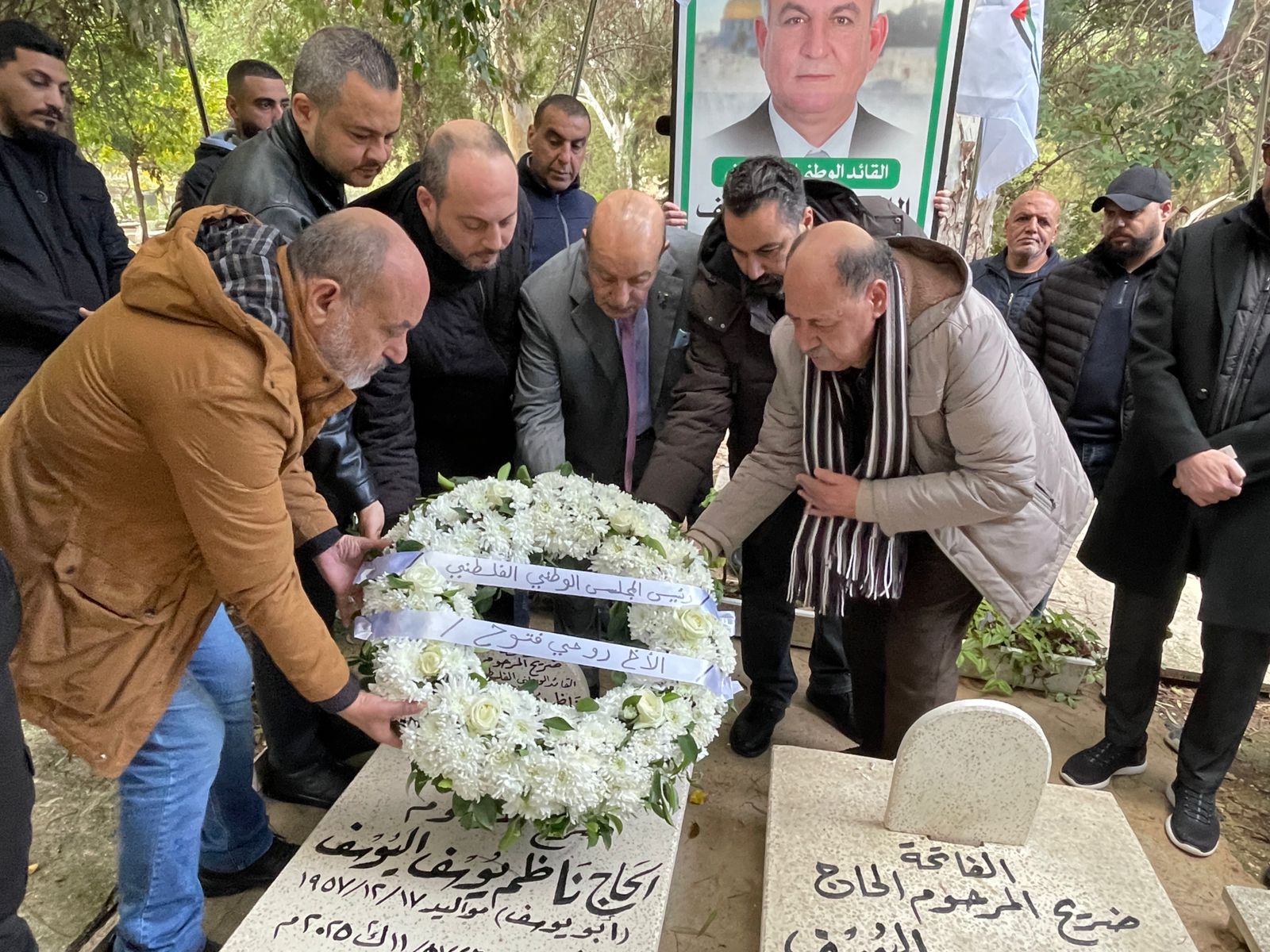 وفي مشهد امتزج فيه الحزن بالعهد، وُضعت أكاليل الورد على الضريح باسم كل من: رئيس المجلس الوطني الفلسطيني روحي فتوح، ممثلا بعضو المجلس المركزي السفير خالد عارف، وأمين سر المكتب السياسي للجبهة بلال قاسم، والدكتور علي كنج، وذلك بمشاركة العقيد فراس بركات، إلى جانب قيادات وكوادر الجبهة برئاسة مسؤول الساحة اللبنانية وعضو المجلس الوطني يوسف ناظم اليوسف وعائلة اليوسف التي ظلّت شريكة الدرب والتضحية.