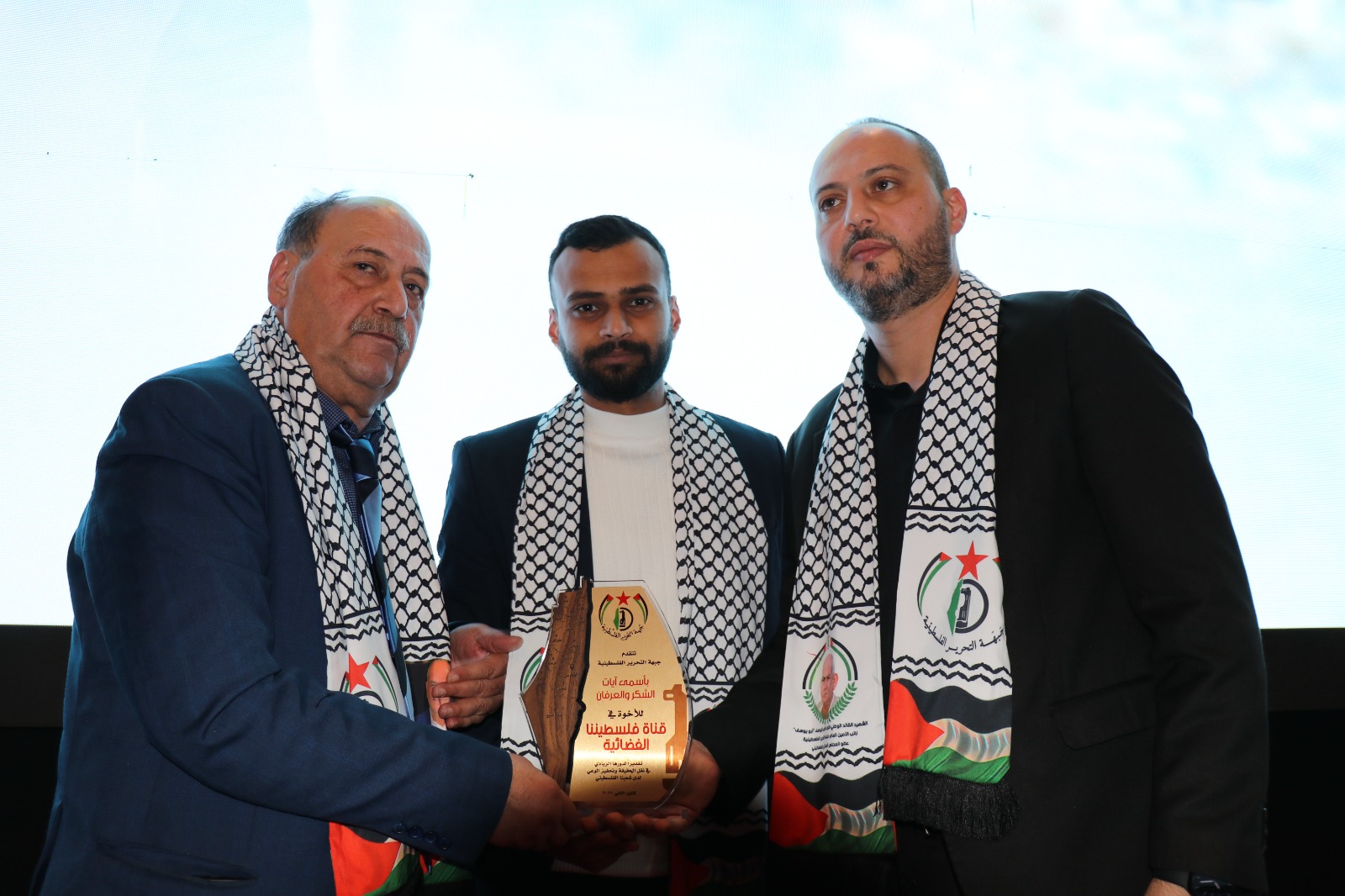 وفي الختام كرمت الجبهة كل من رجل الاعمال صاحب “صالة لاسال” عضو المجلس الوطني السيد سامي بقاعي لدروه الوطني ومساهمته في تنظيم المهرجان، وقناة فلسطيننا ممثلة بشخص مديرها العام، مسؤول الاعلام في اقليم لبنان لحركة فتح يوسف زريعي، وقدم قاسم واليوسف درعين تذكاريين لهما.